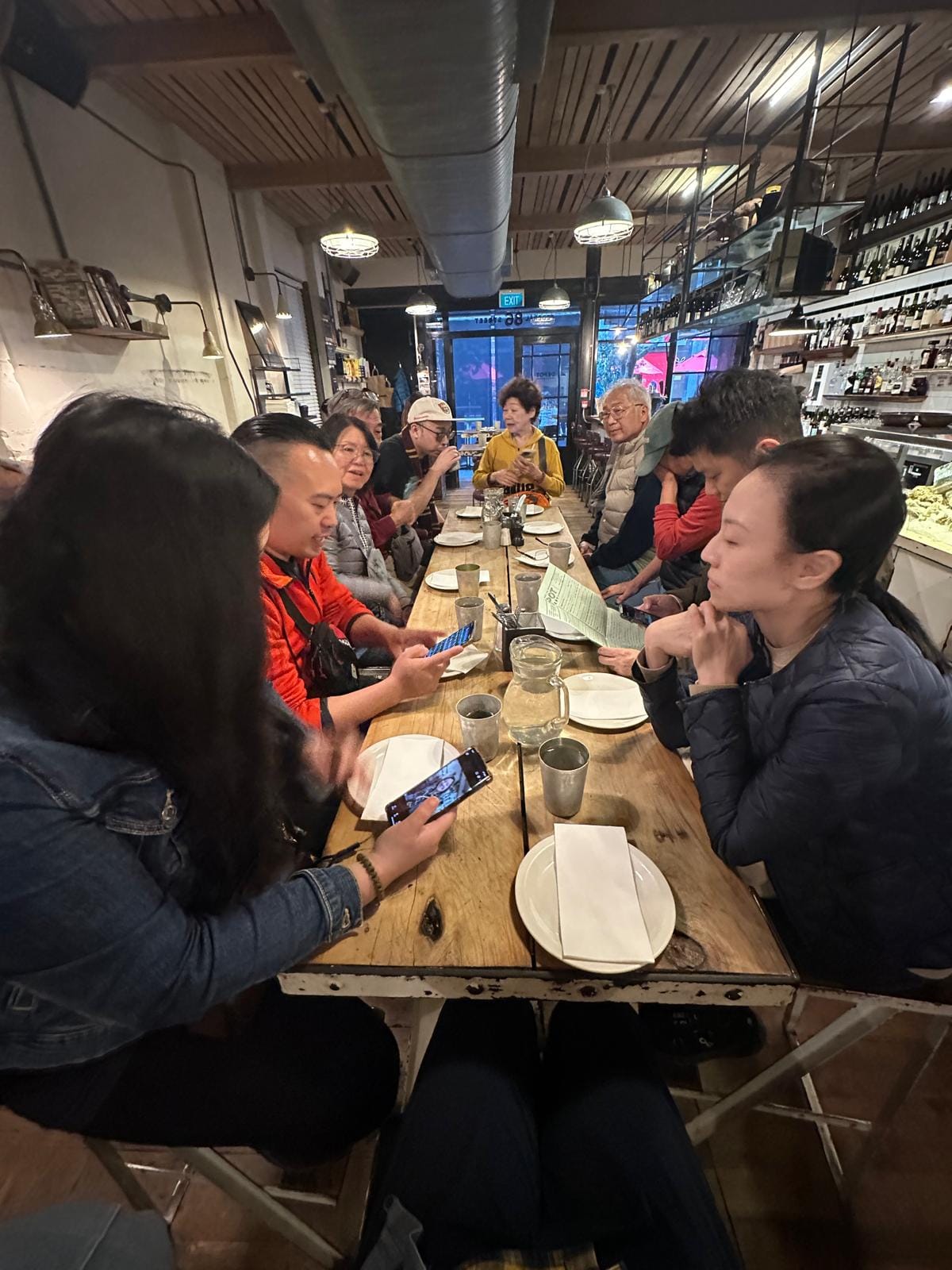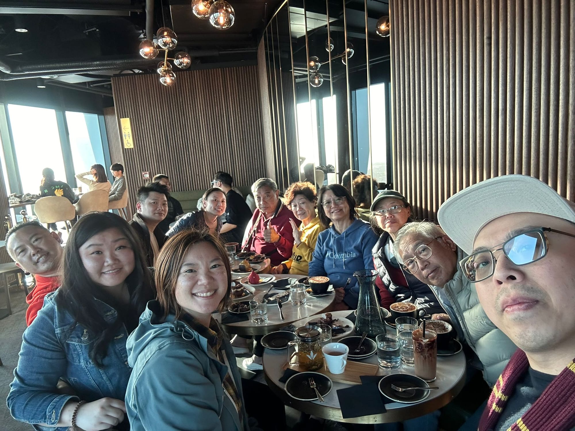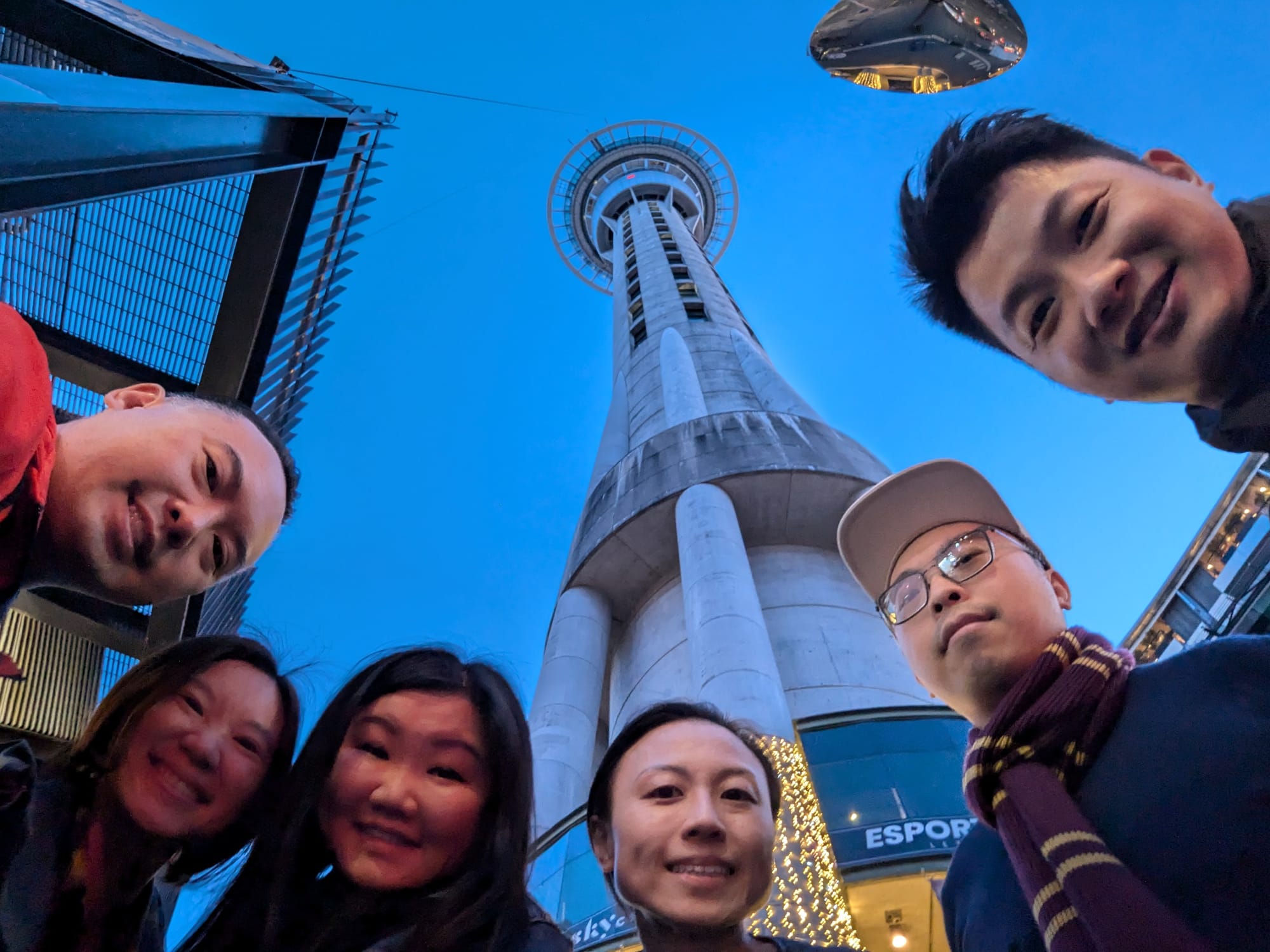 After enjoying the cakes, we went outside to walk around a bit before leaving for our dinner reservation. Took a group picture with the tower. Similar, but not as tall as the CN Tower.