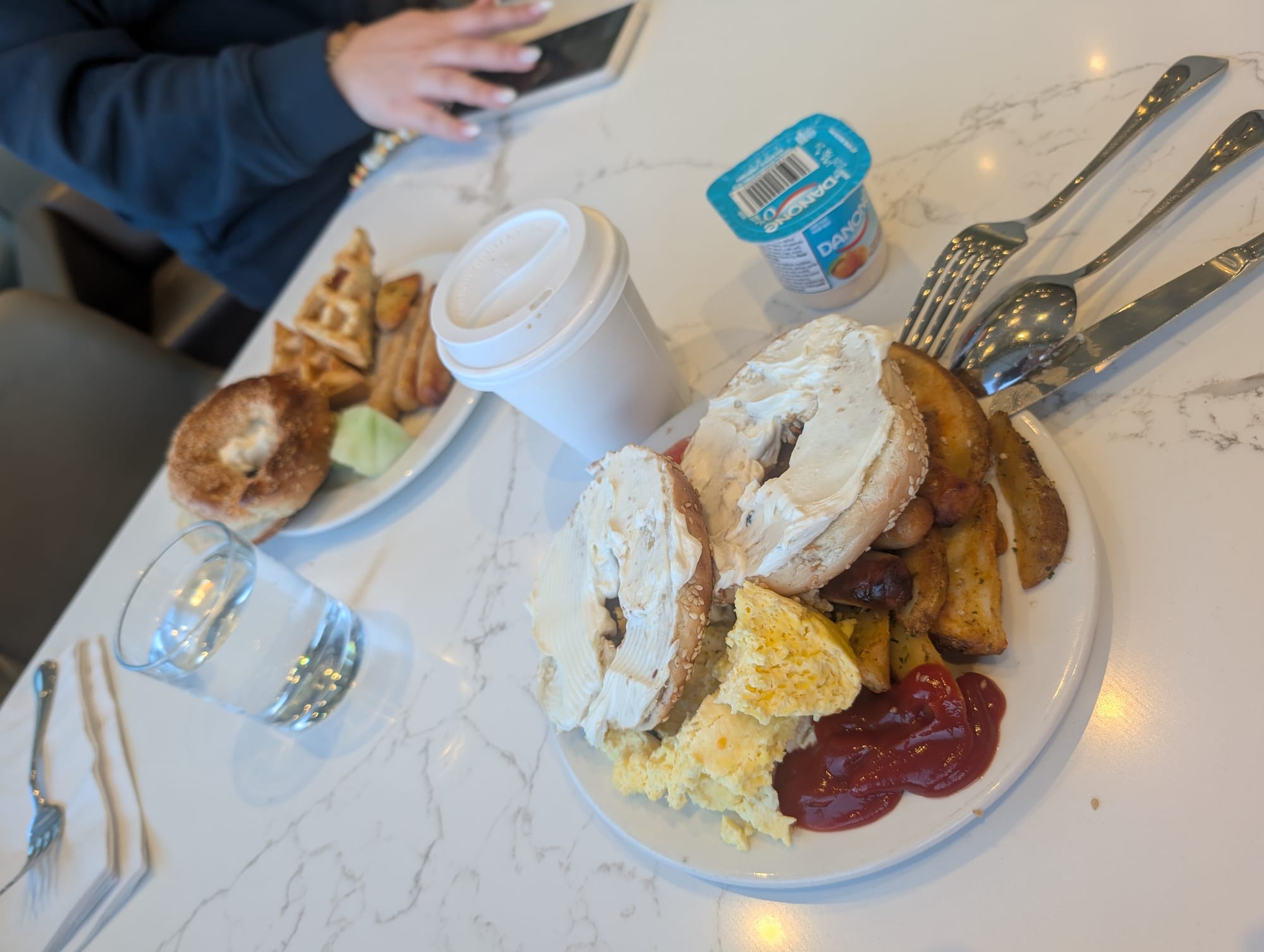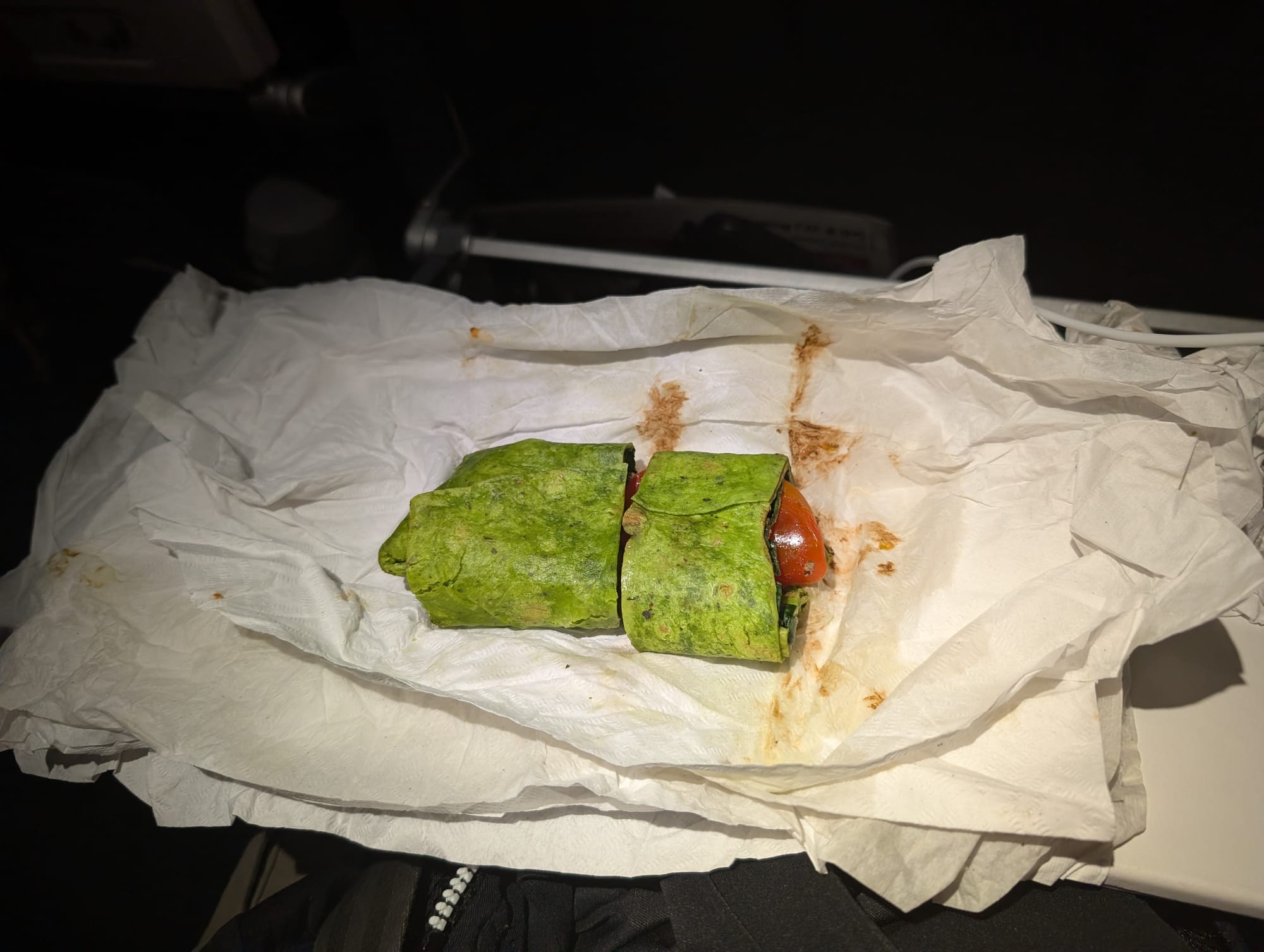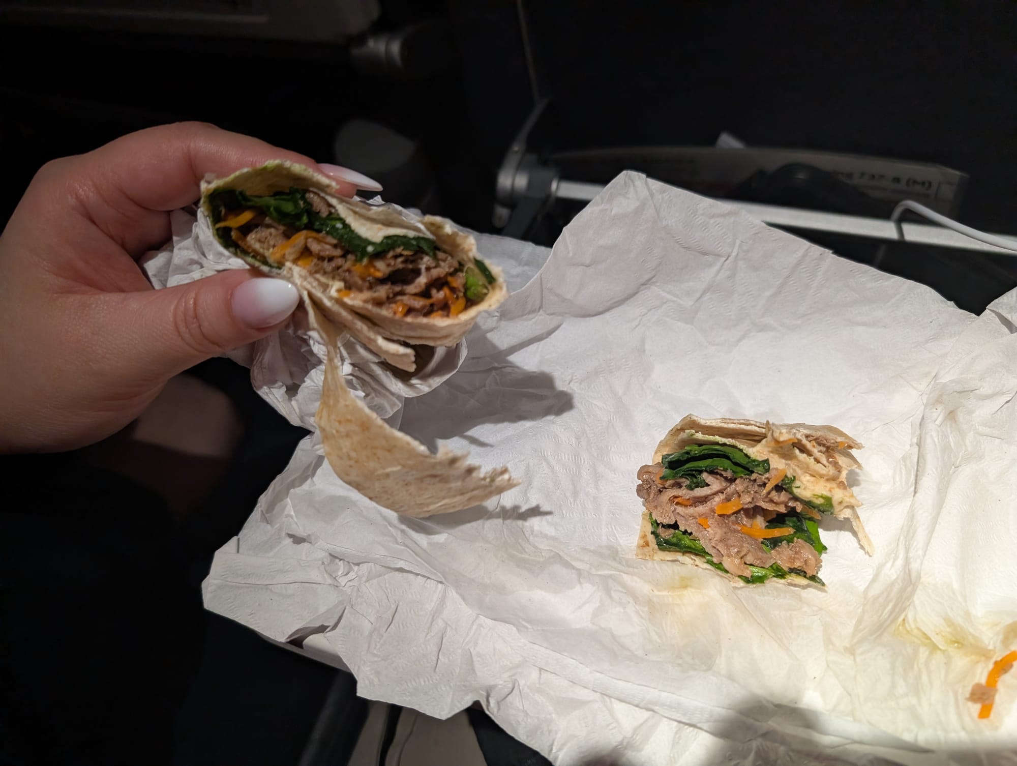 While we were in the lounge, we were excited to see that there was no one seated next to us on this last leg. Unfortunately, that wasn't the reality. There were a lot of standby's put on the flight, and ended up being a full flight. This leg felt really long. We had already been up for a long time, and eyes were feeling really heavy. Took a nap and woke up kinda hungry. So time to have the wraps we grabbed from the lounge