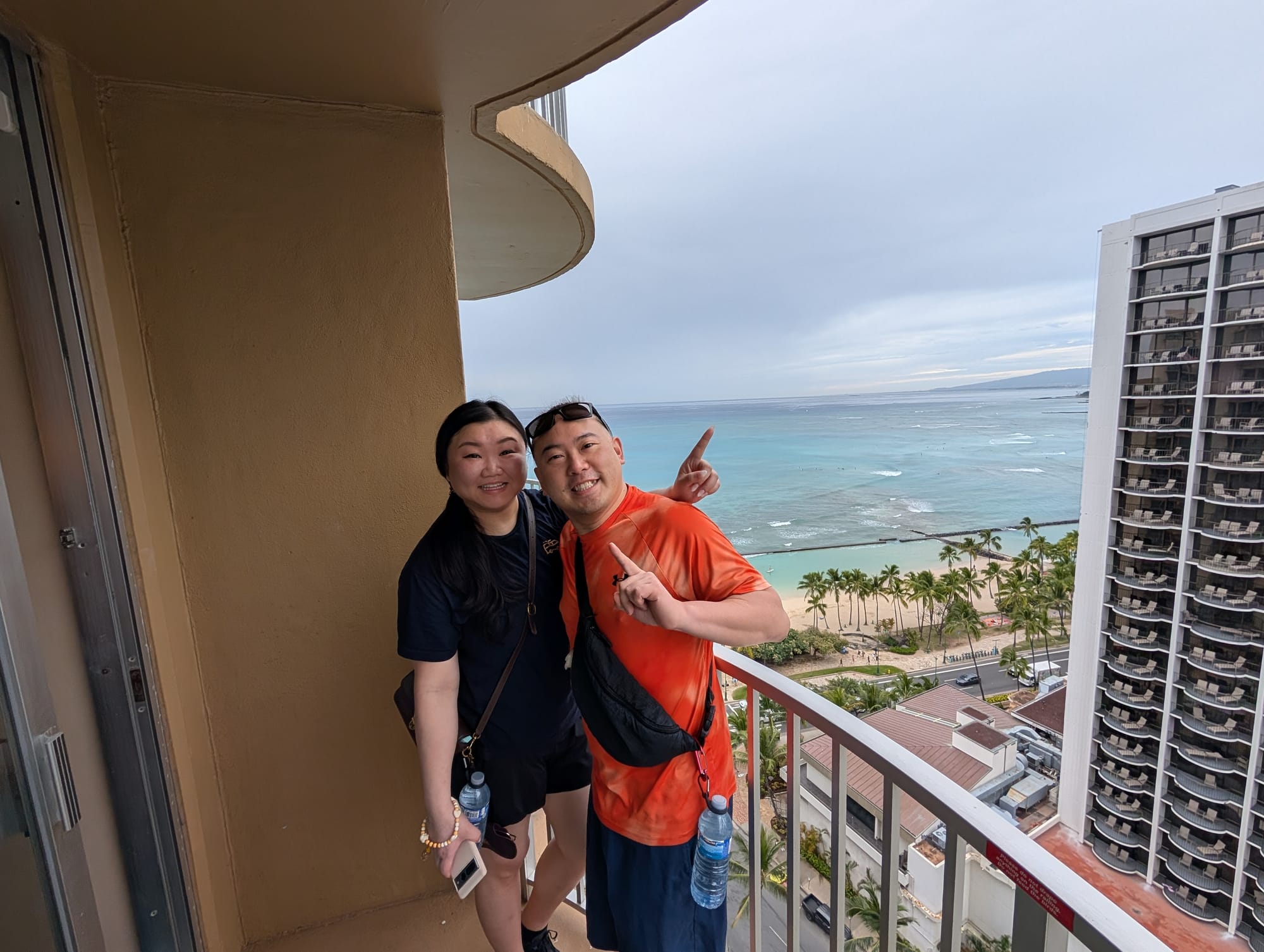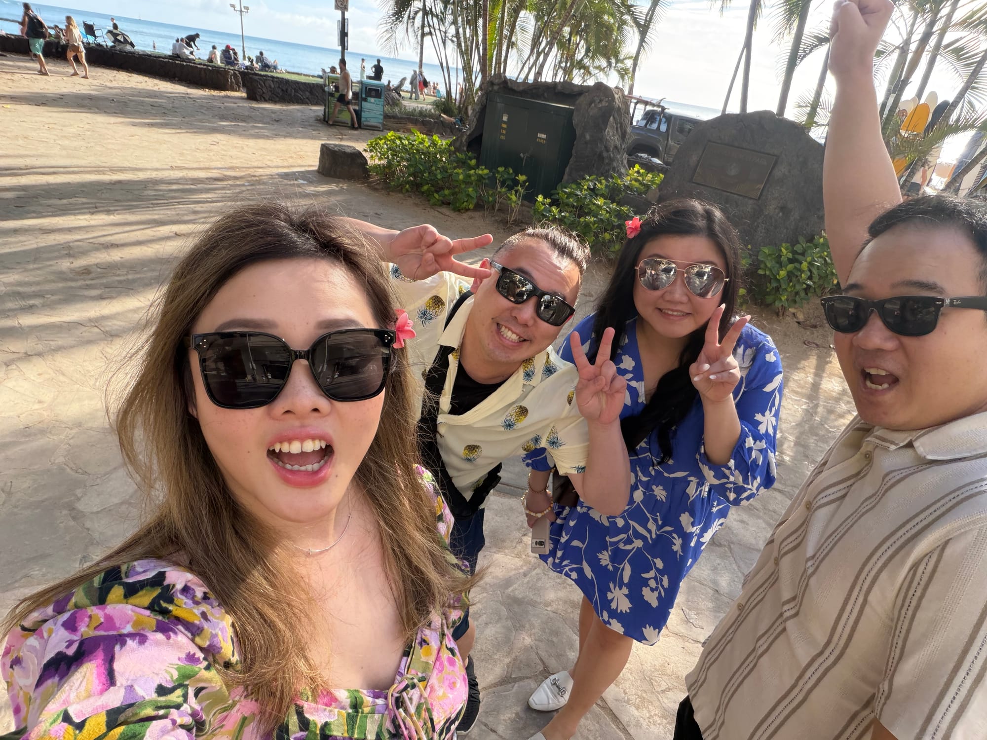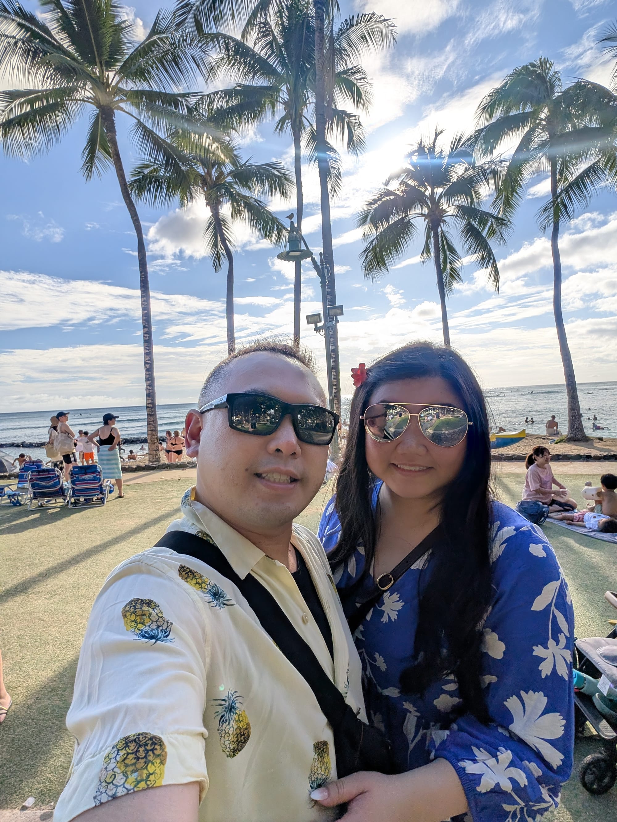 Starting to realize a trend. Hawaiians really don’t have good rice. But not we’re back at the hotel. Time for a quick rest/break, and to get ready for the Luau tonight. To get there, we meet up at Waikiki beach, and order our Uber. We decide on the cheaper option of Wait and Book, and so we’ve got time to wander and take a bunch of pics by the beach