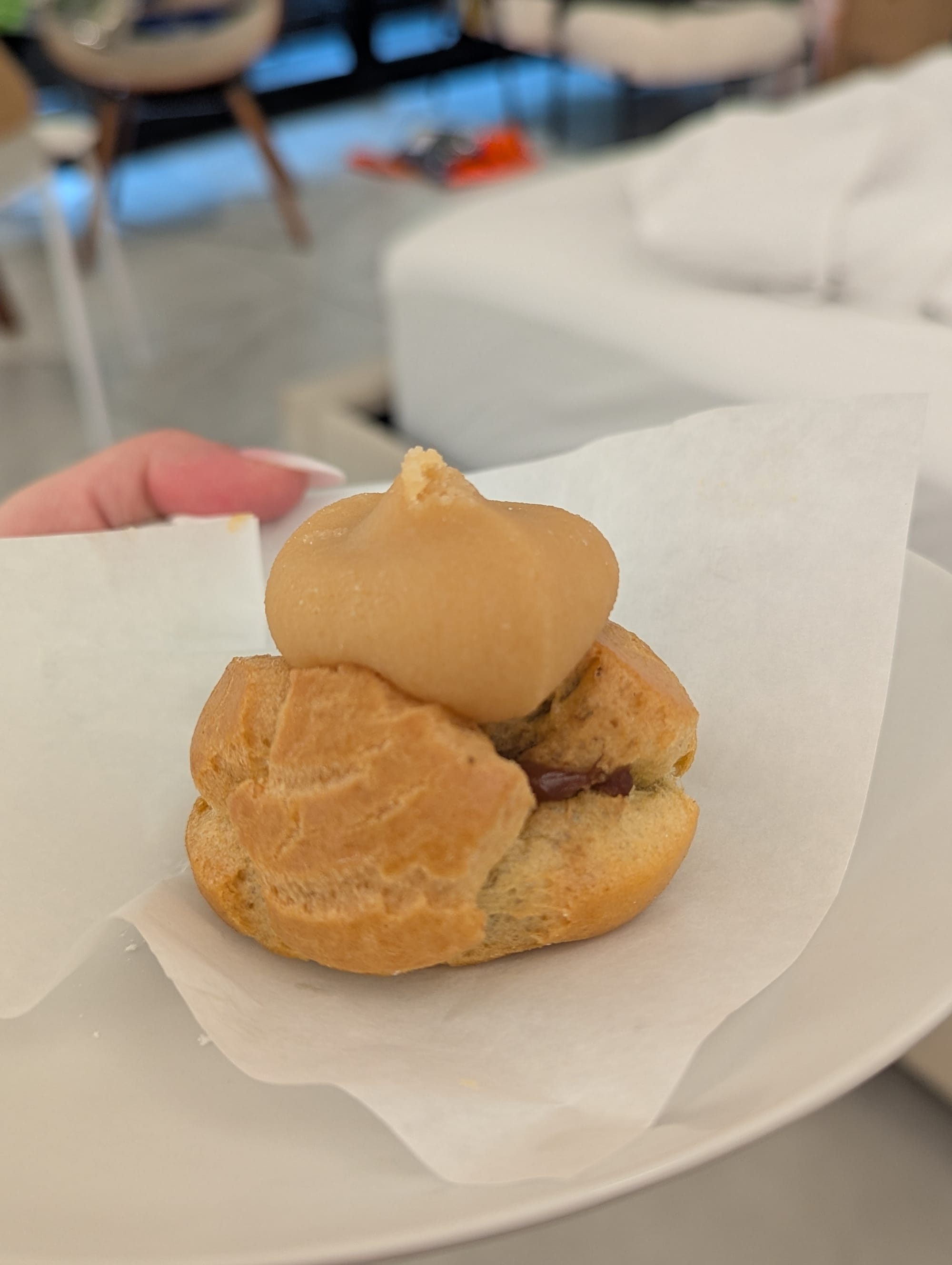 We got an apple filled malasada, and a coco puff. The puff was heavily recommended by all the reviews. The malasada was a bit too eggy, but the puff was great. The reviews didn’t let us down.