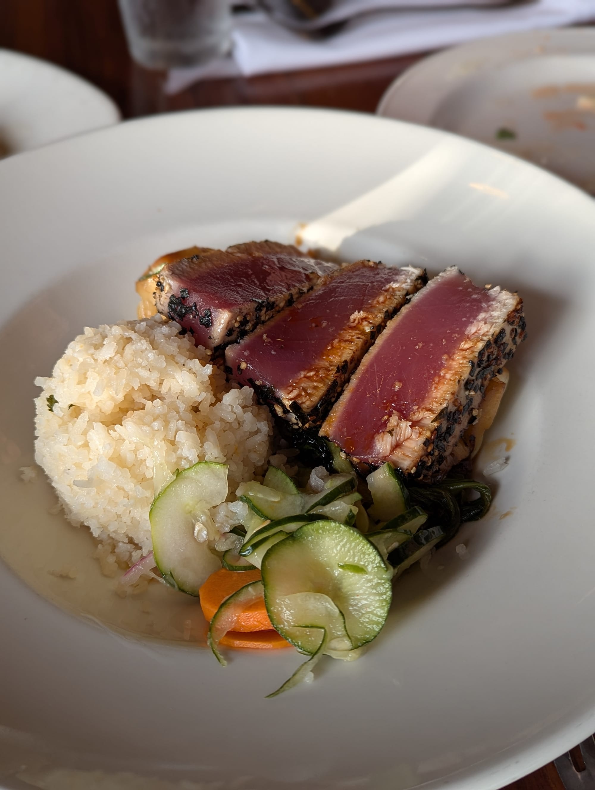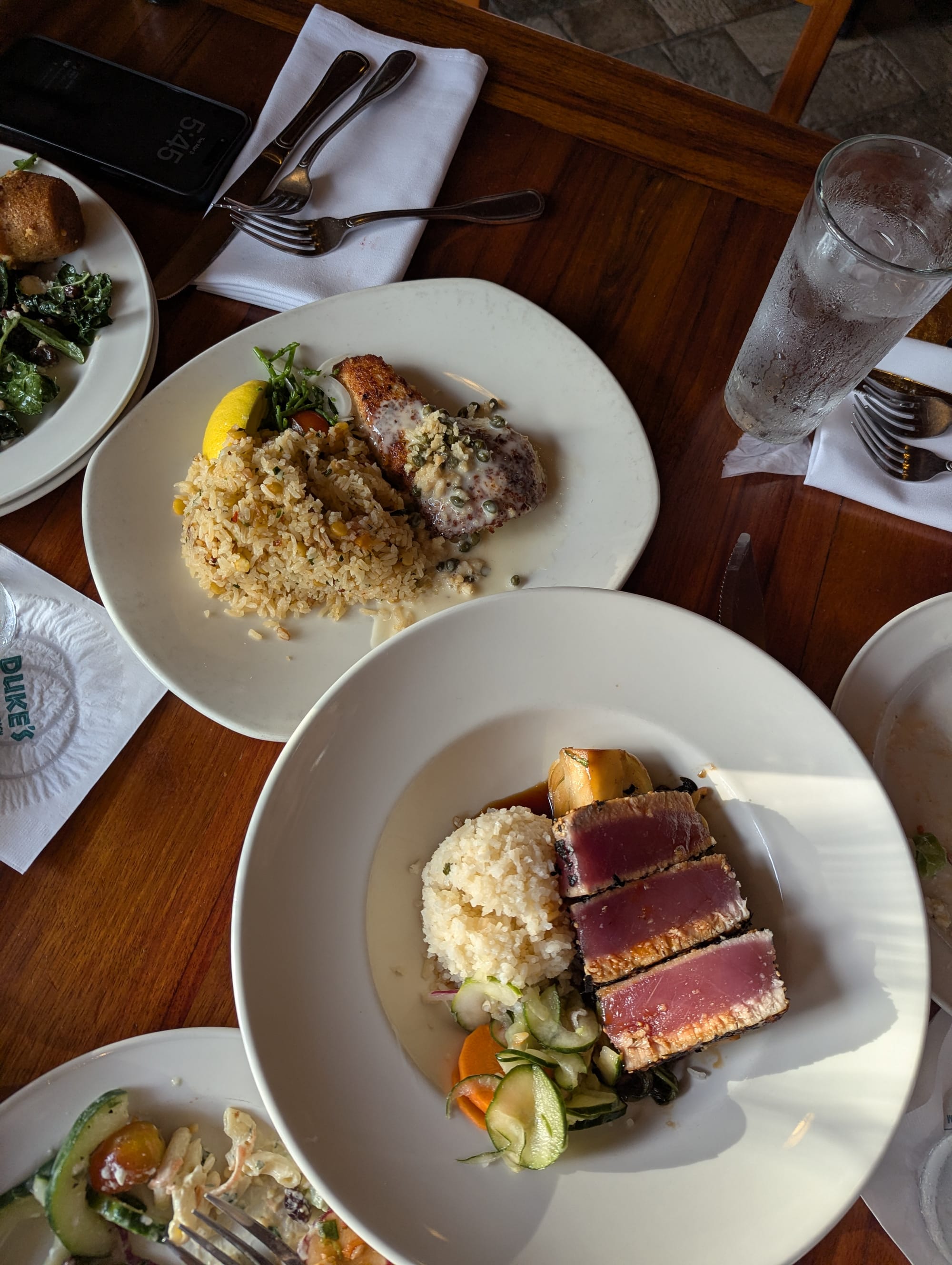 After looking at the menu for a while, we placed our order. We had 4 mains, and added the salad bar option to 2 of the meals. After filling a plate with salad, we thought it might be a better option to remove 2 of the mains, and just have salad bar all around. We hadn’t really eaten any veggies since we arrived in Hawaii. So we stuck with an Ahi Tuna Steak, and a Coconut Crusted Fish, and salad bar for each of us.