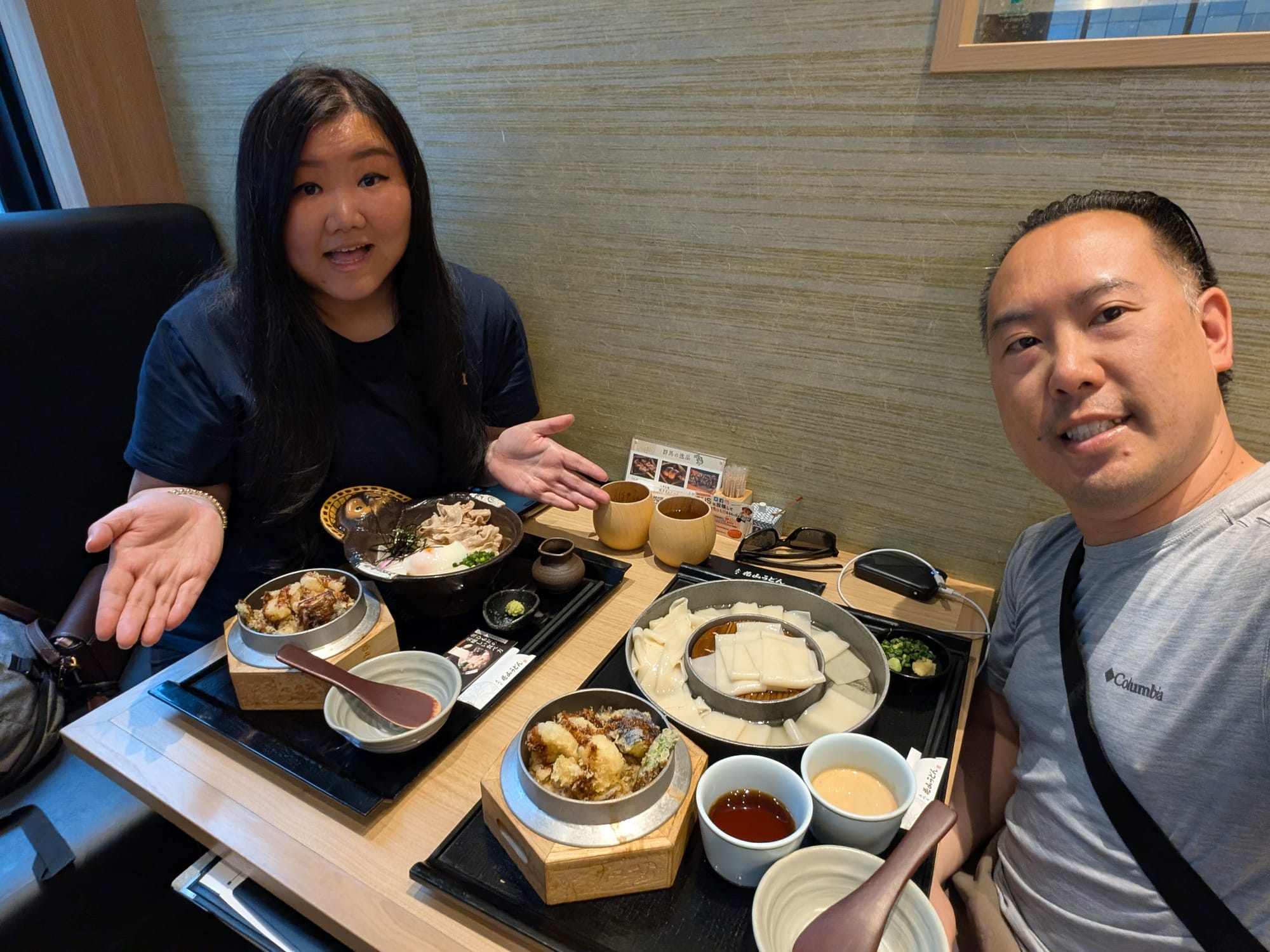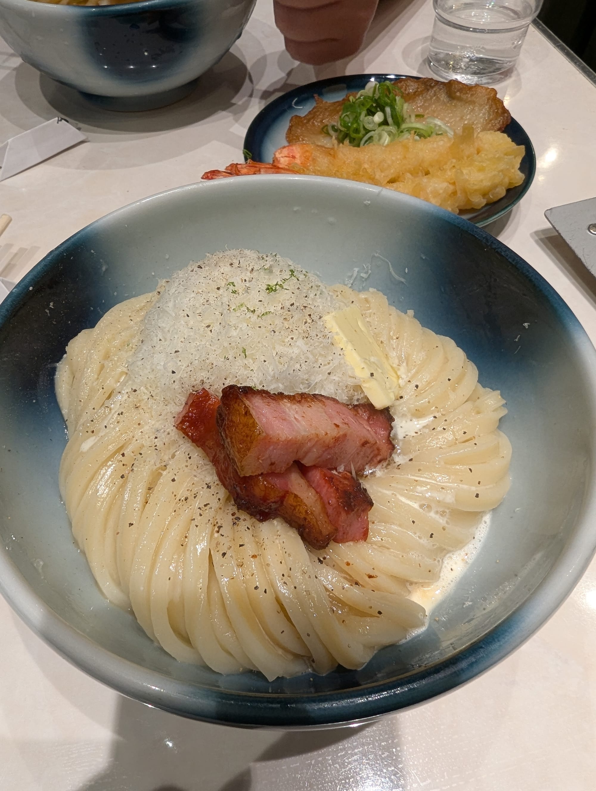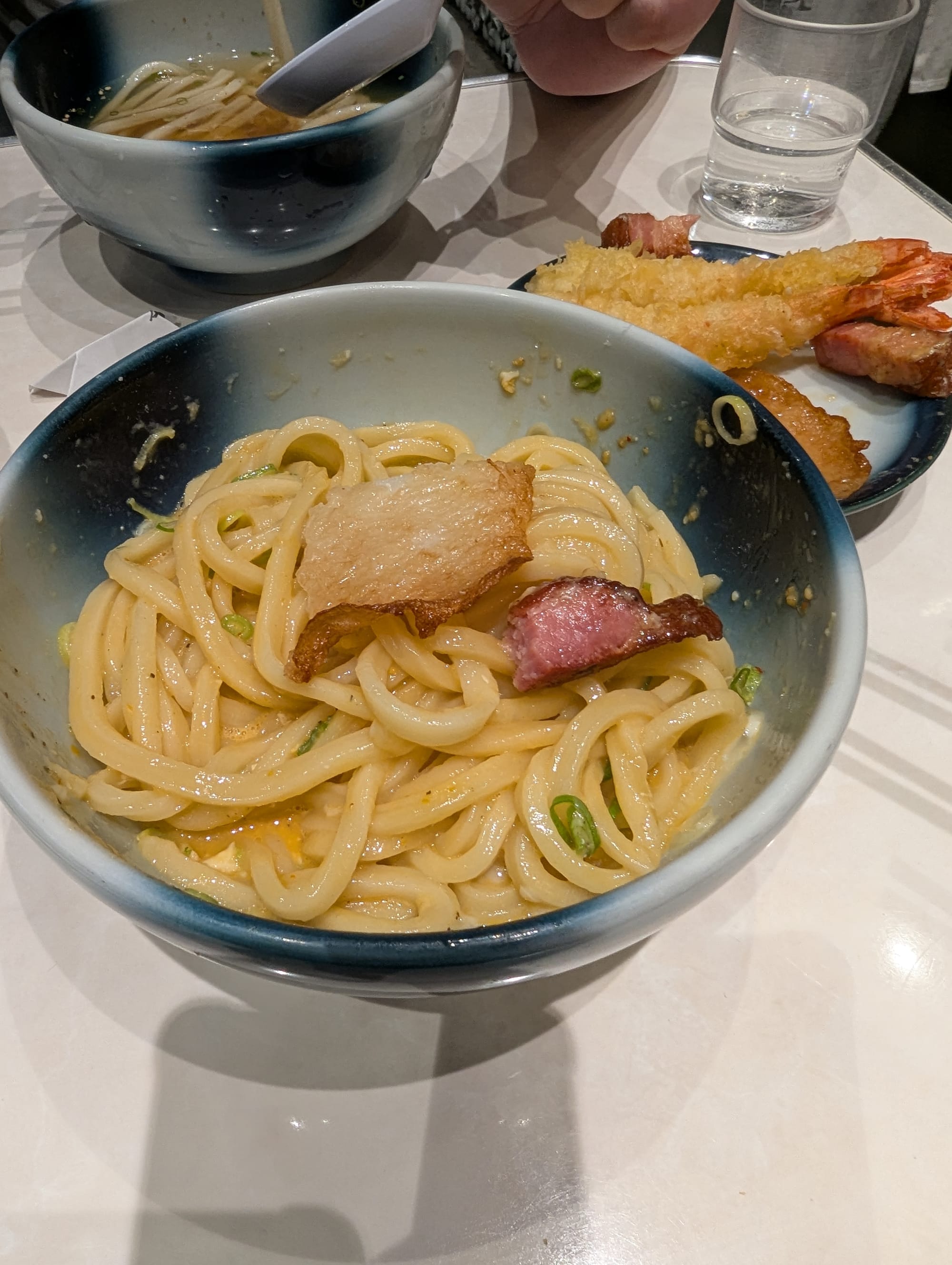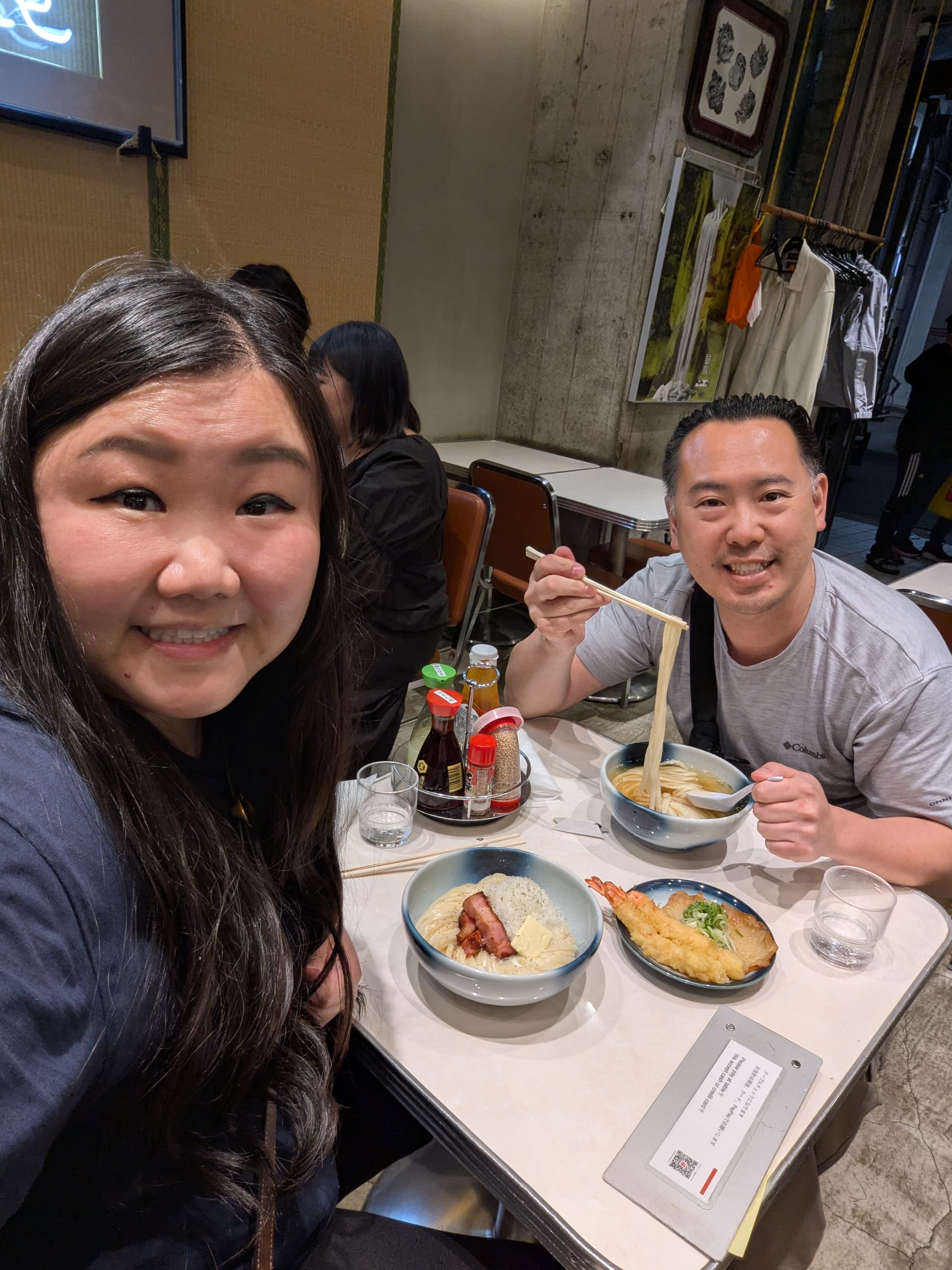 Then, we decided to have more udon for dinner. This restaurant is named Menchirashi. We arrived in line around 8:15pm, and luckily we did, as they closed their line shortly after we arrived. This line took a while, but it was well worth the wait. Thankfully we had a lot of time to review the menu before the staff came around to take our order. We noticed in the menu, that we could request larger quantity of noodles for free, at the time of ordering (of course we ordered the larger helping). When we finally got seated, we were able to see the table next to us, and the size of their bowl of noodles vs ours. We were thankful to have ordered the larger helping, as it was perfect for our level of hunger . The udon had great texture, and had both cold & hot options (Jonny of course, got the cold udon), while Wincy got the carbonara.