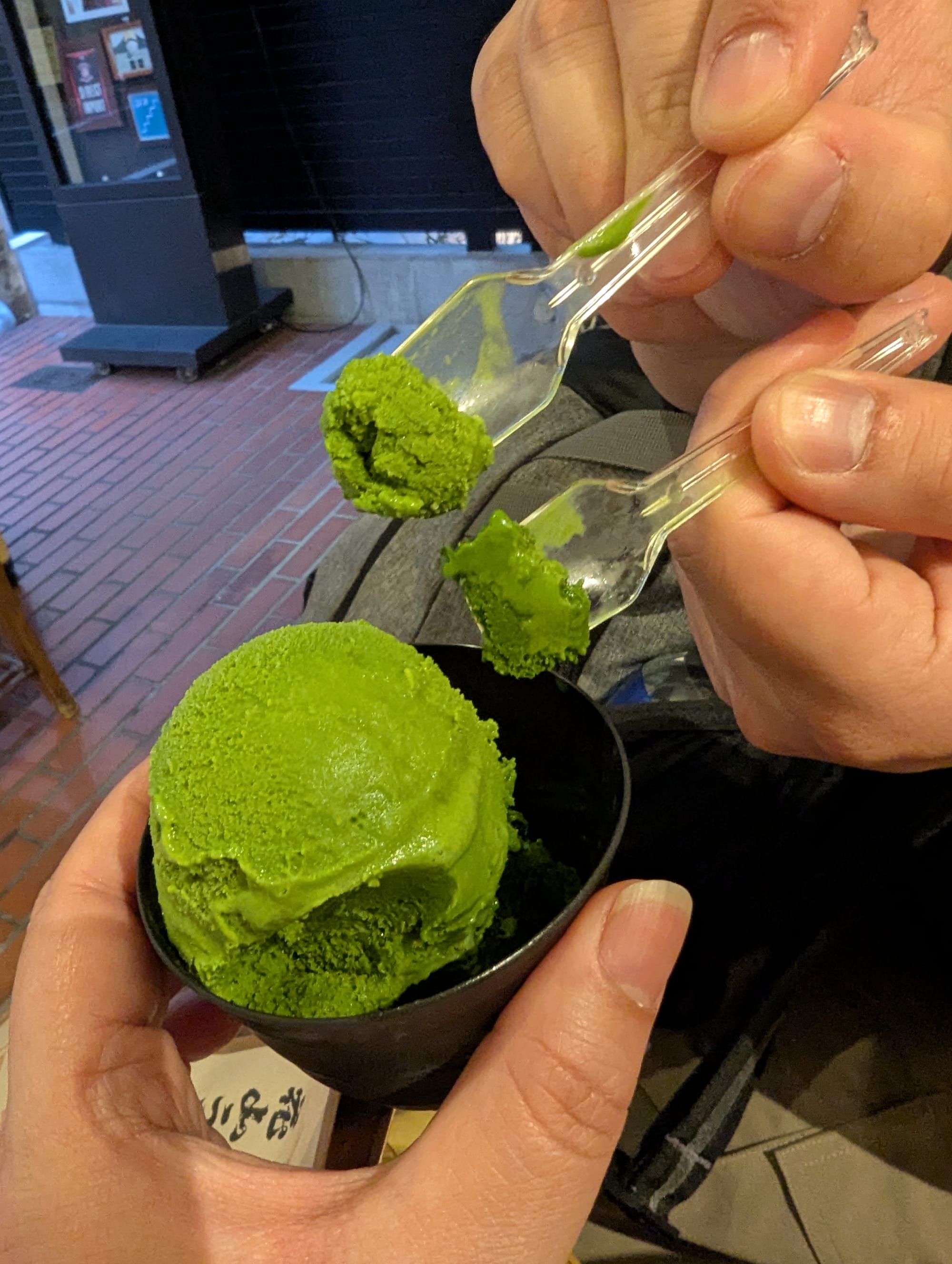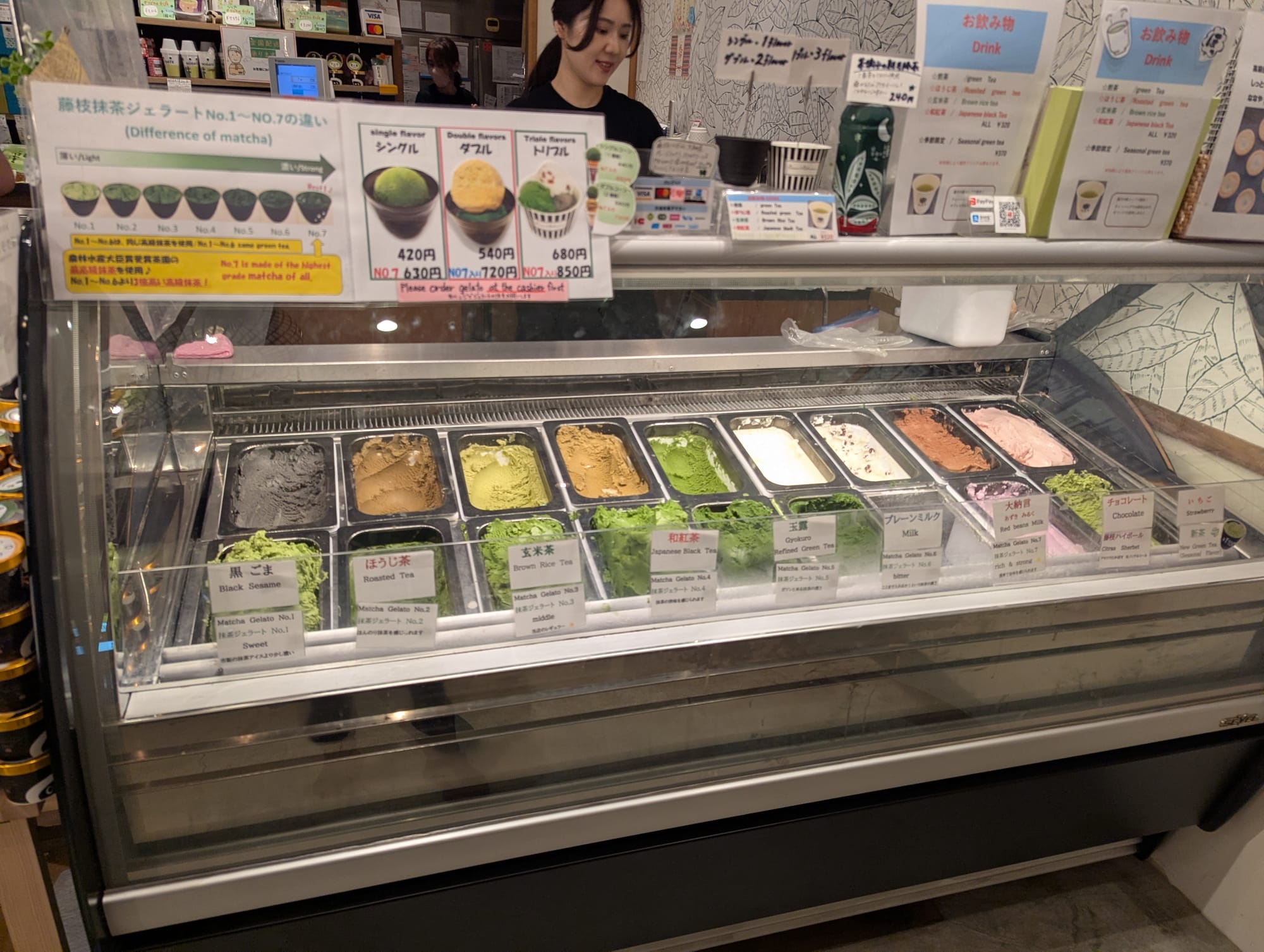 And as we walked around the area, we stopped into a small matcha shop, where we order 2 scoops of matcha ice cream. This shop serves matcha ice cream of various grades, and so we thought we'd try 2 different grades to see if we could tell the difference. We decided to tray grades 4 and 7. 7 was definitely richer.