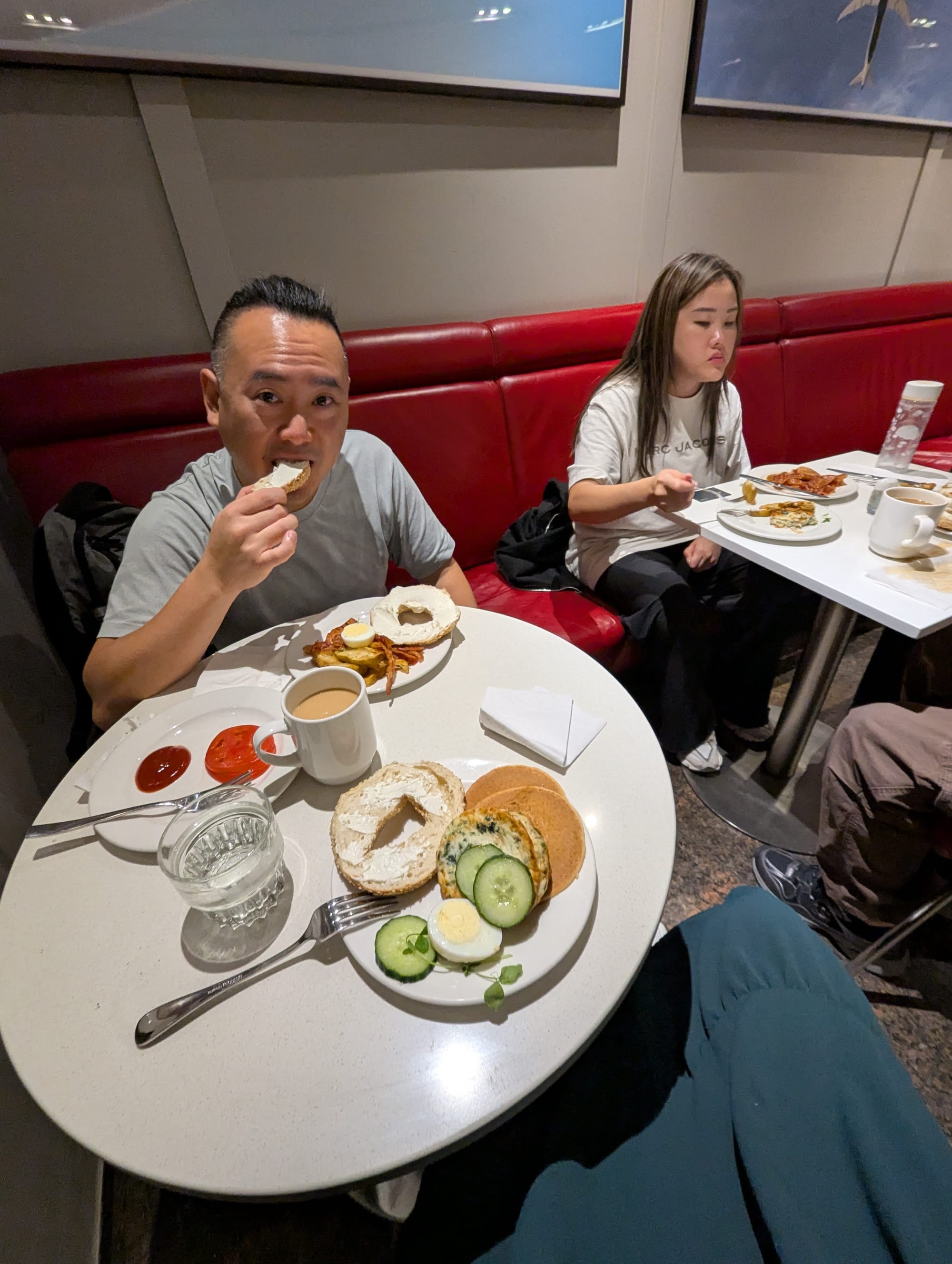 Flight day! After checking in, and dropping off our bags, off to the lounge we go to get some much needed coffee and breakfast.