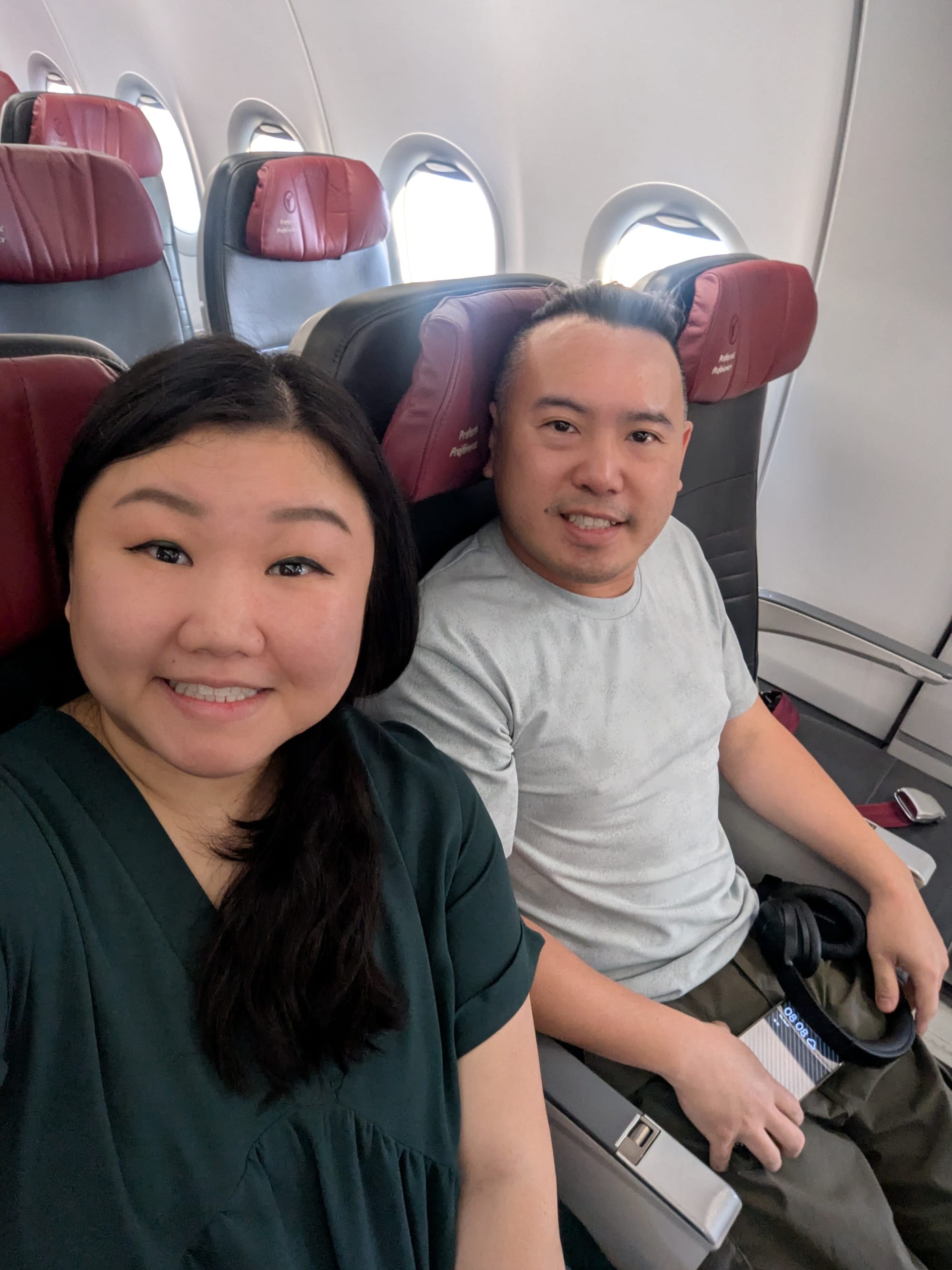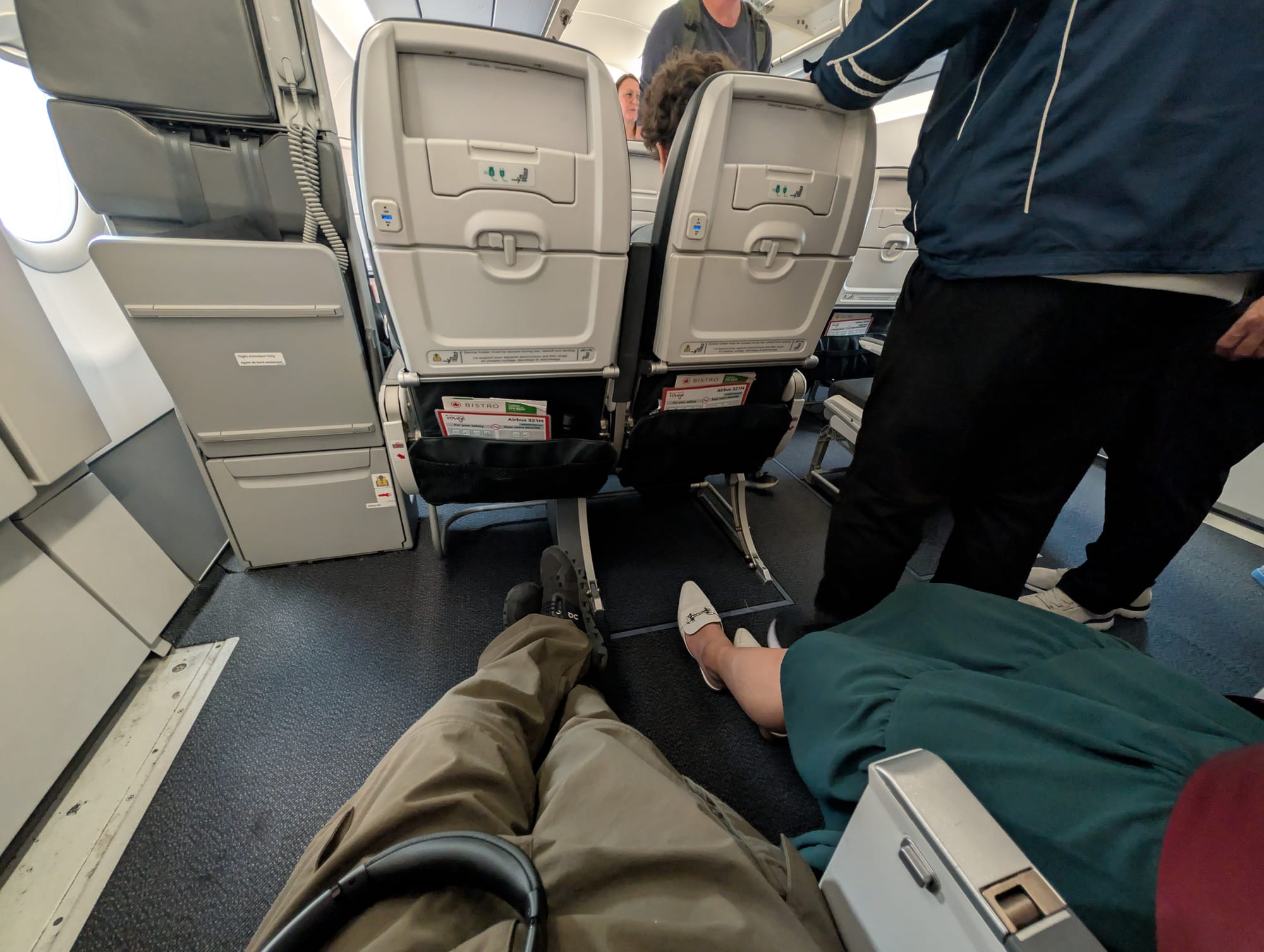 Then boarded the plane, to our "premium" seating in economy. Look at all that extra leg room!