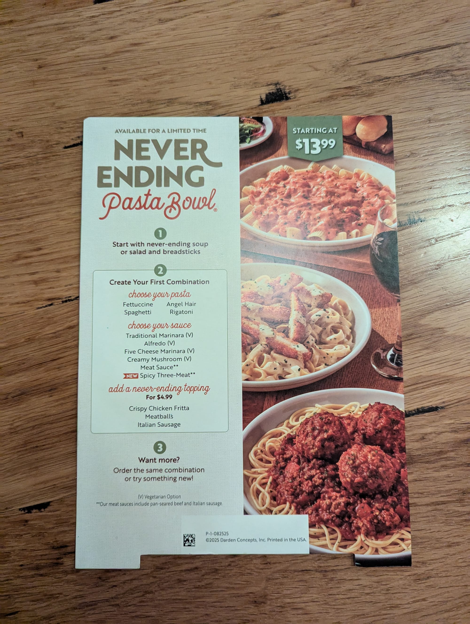For dinner, we went across the street to Olive Garden. We saw they had this promotion for Never Ending Pasta Bowl. We thought we could eat more, but only managed 2 servings each. Had plenty of soup and salad though!