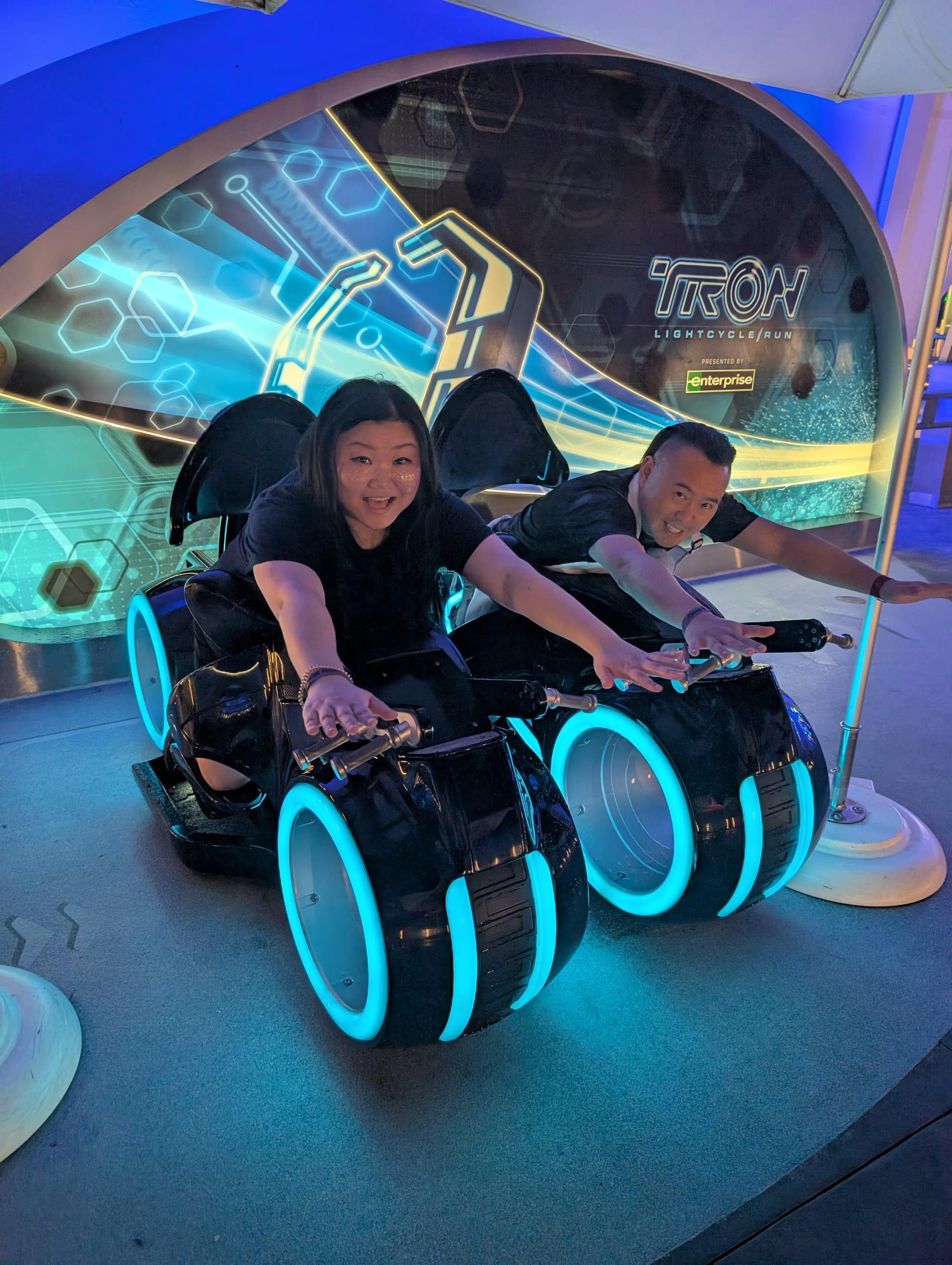 We had a plan! Fireworks, then do a mad dash for Tron! We were hopeful that this would result in a shorter lineup. While this plan worked, many others had the exact same plan! 😝 We could see many people doing the mad dash for that area of the park. We eventually started to speed walk, then run, so we could get a better spot in line. We finally got into the line with a 25 min wait, which is much better than anytime during the day. We watched the wait times for Tron all day, and never went below 60 mins