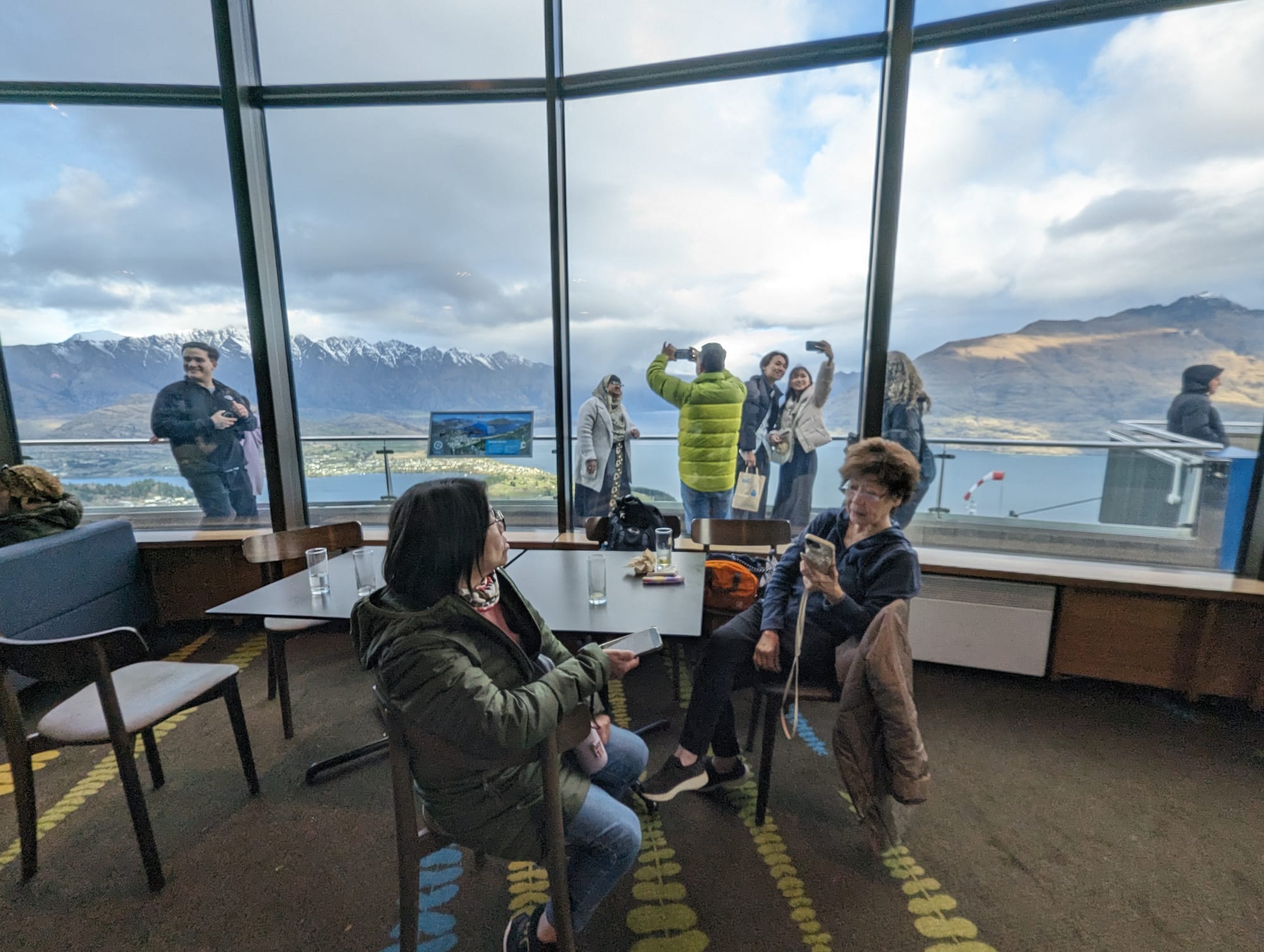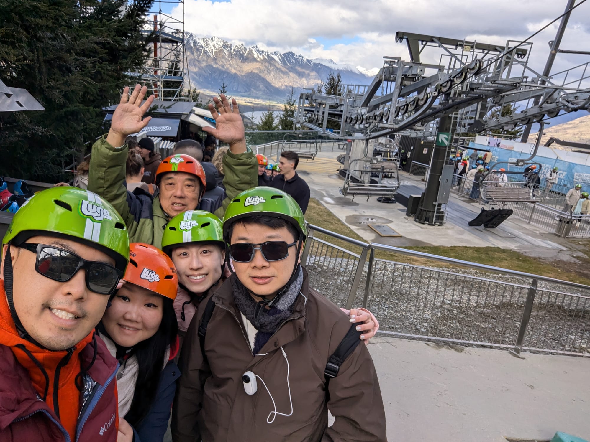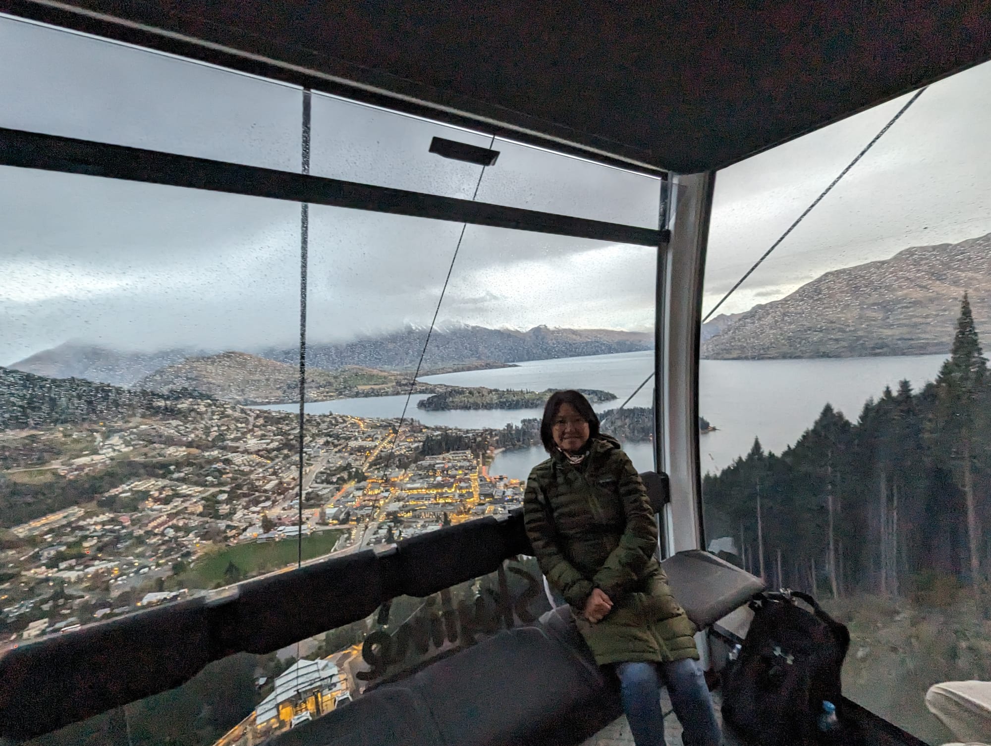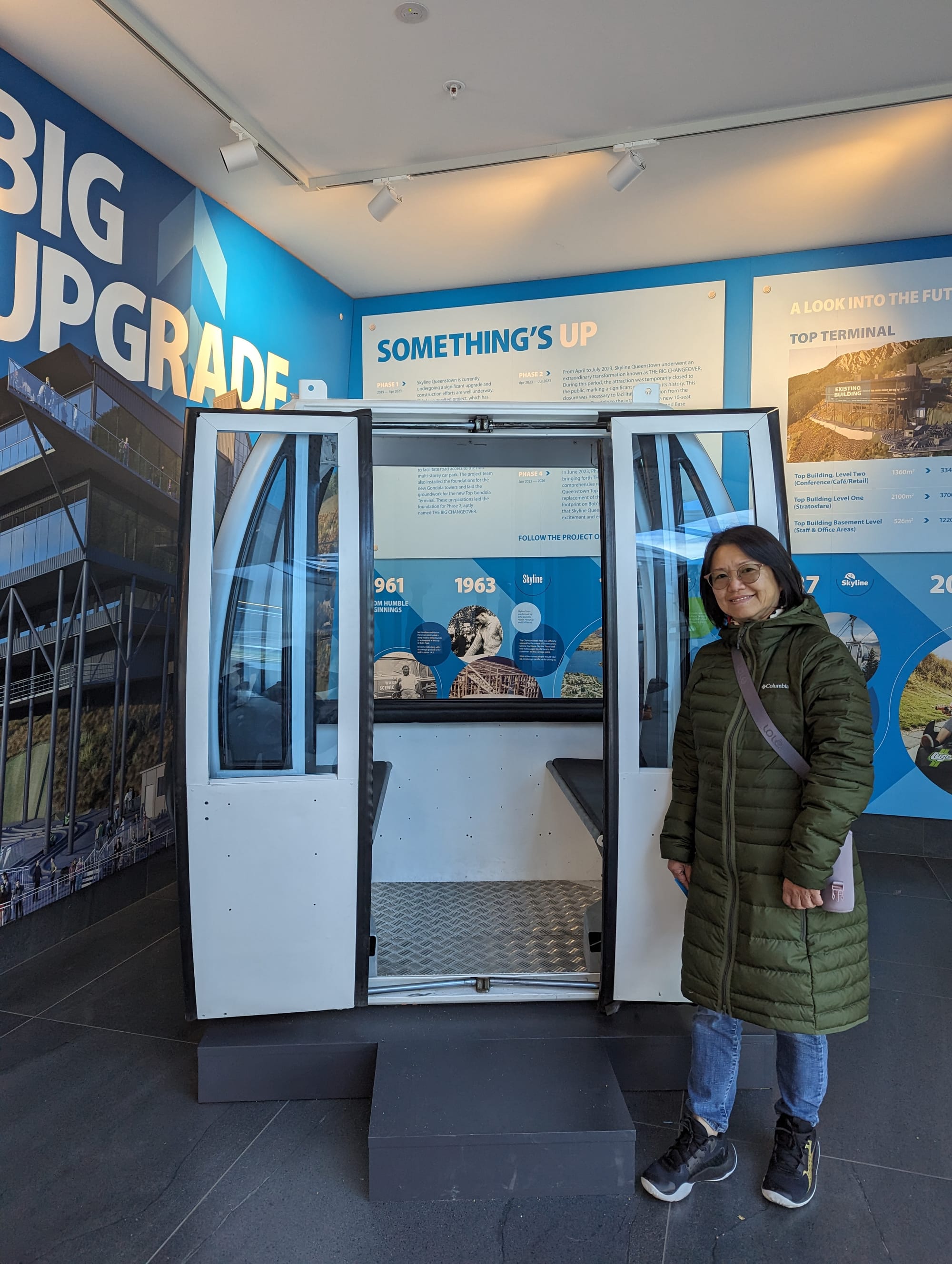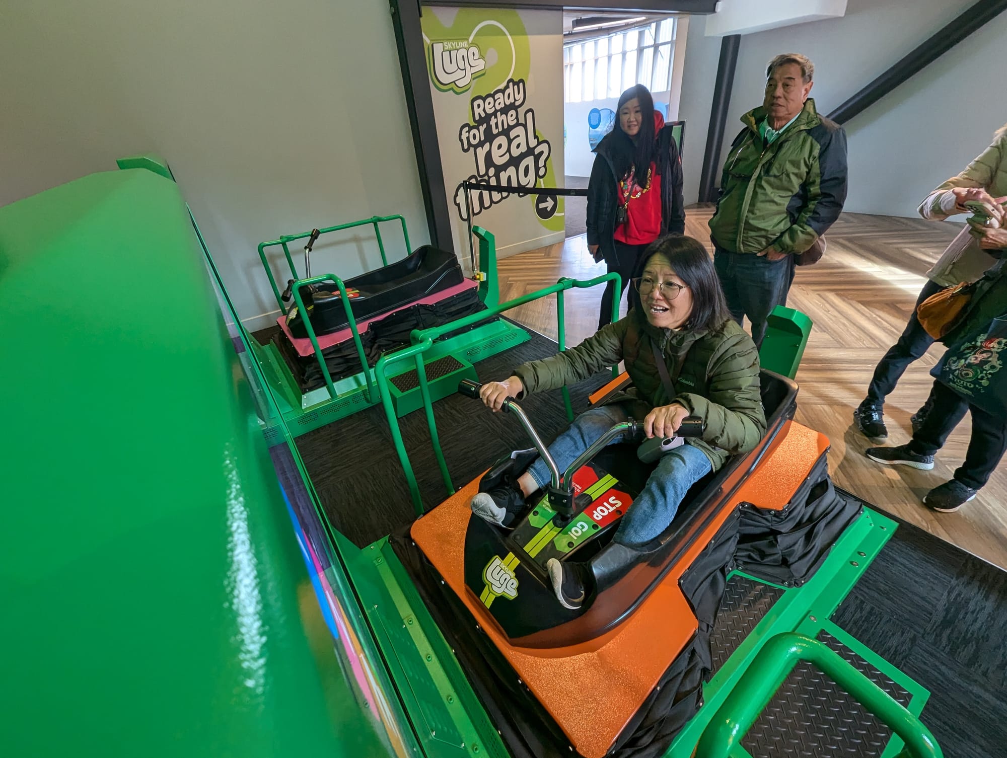 We're headed to the top, so most of us can take part in another activity. It's called the Queenstown Skyline Luge. Mom wasn't taking part in the activity, but we got her to try the virtual version. She looked pretty stressed