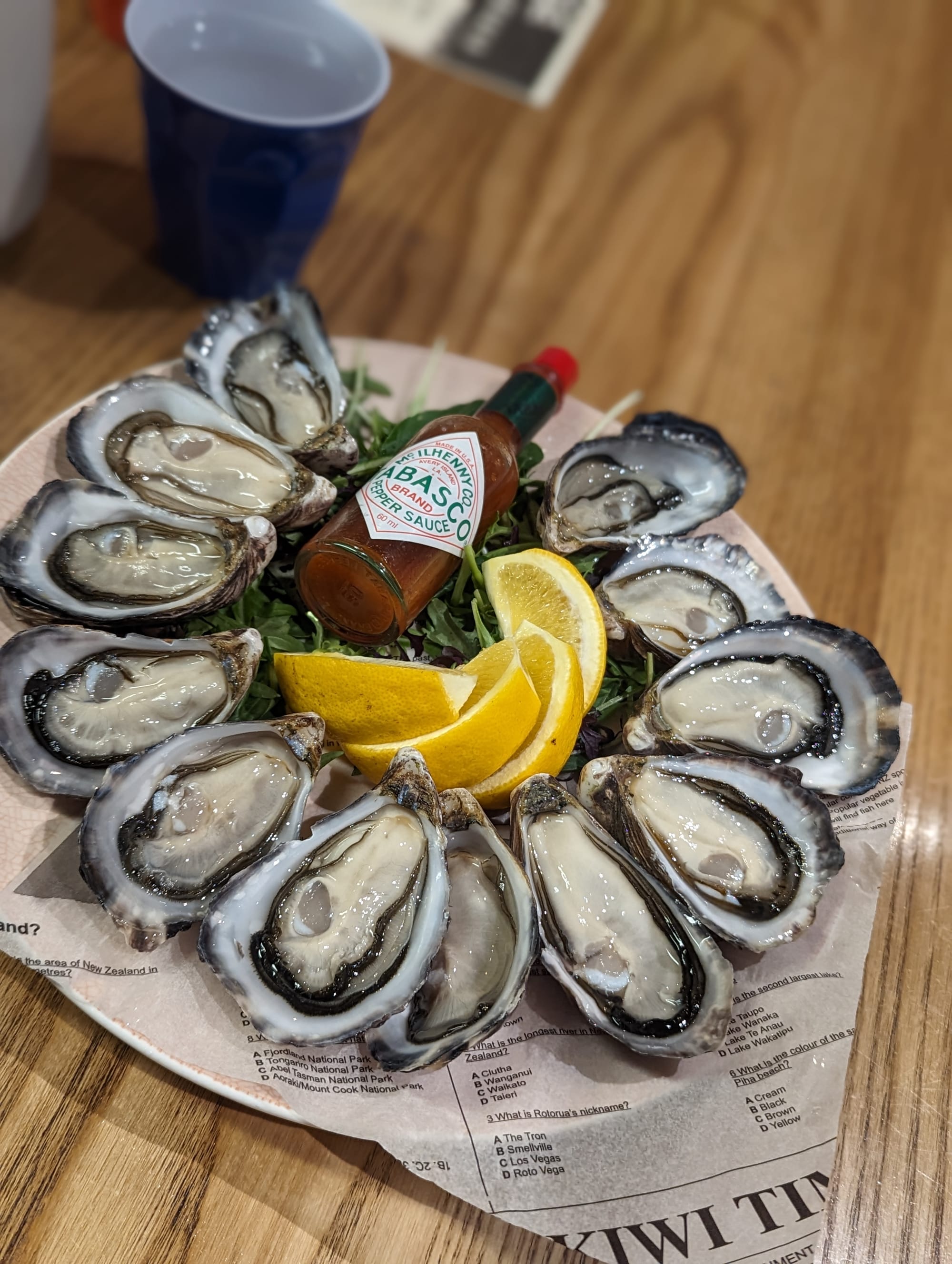 New Zealand is well known for a particular breed of oyster called Bluff Oysters. We we at the end of the season, which made it tough to find a place that still had any stock. We tried a spot in this town, and unfortunately they were also out. We still decided to get some oysters though, to enjoy before dinner.